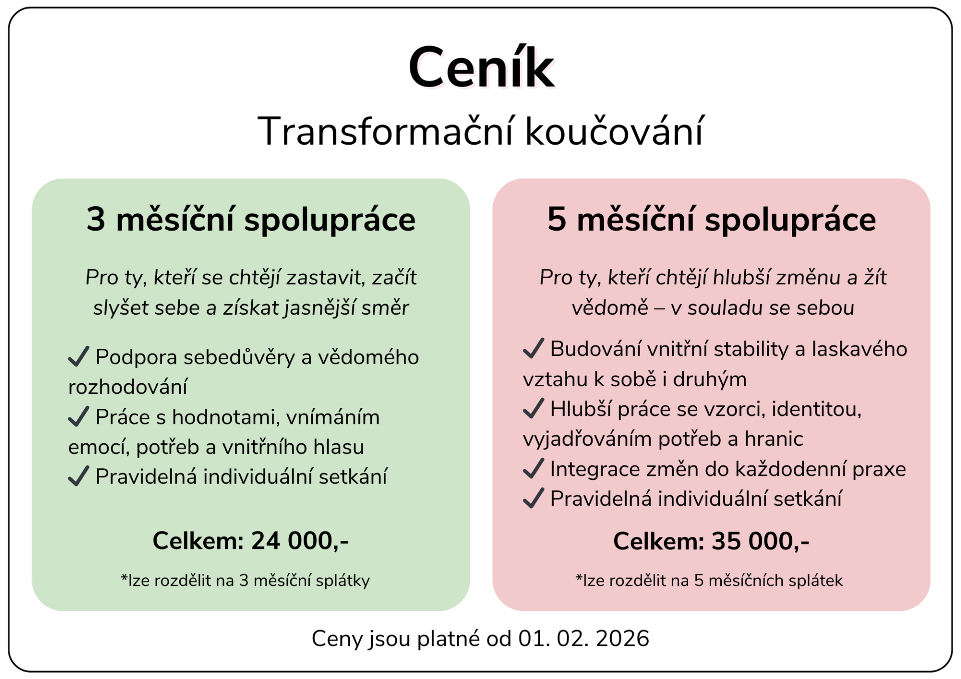 Pro skutečnou a dlouhodobě udržitelnou změnu doporučuji spolupráci v délce alespoň 5 měsíců. Tento časový rámec umožňuje nejen nastavení změn, ale i jejich postupnou integraci do běžného života. Pokud je pro vás pět měsíců příliš dlouhé období, je možné začít kratší (např. tříměsíční) spoluprací a podle potřeby ji dále prodloužit.